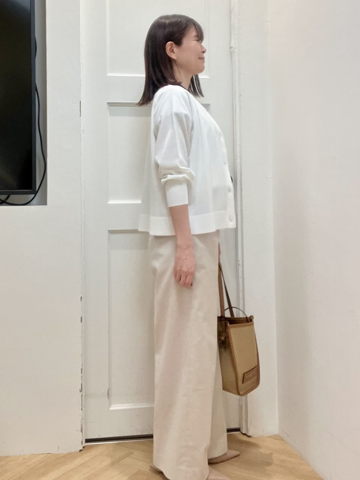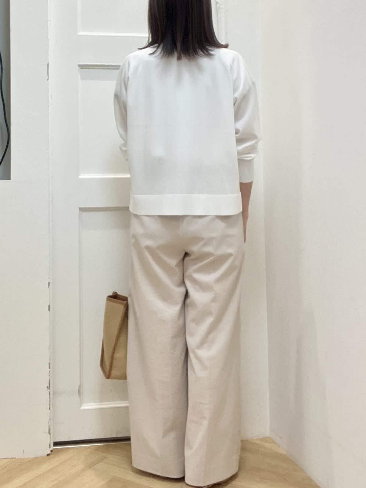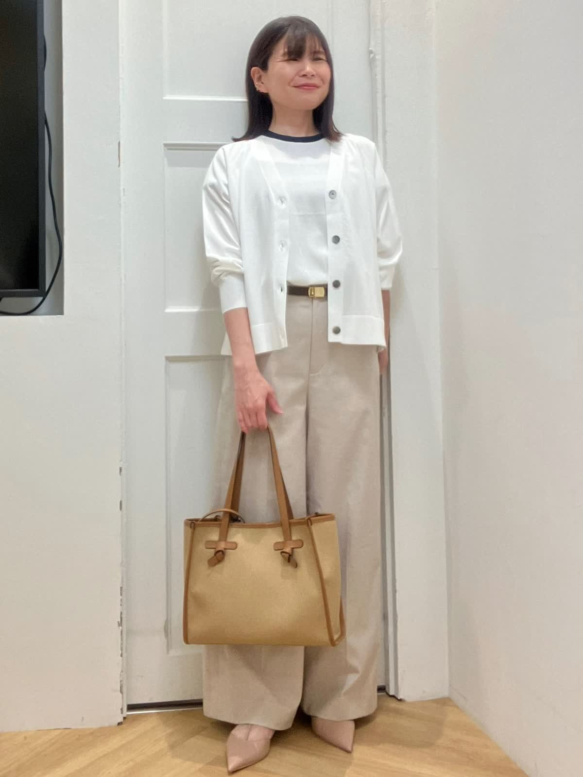 【着用サイズ】全て9号 【着用カラー】ニット:オフホワイト パンツ: ベージュ 初夏の通勤スタイル サラッと快適な着心地のニットは夏場の冷房・日焼け対策にも◎ 白のプルオーバーだけ配色になってます。単品でも着回しが効くのでアンサンブルでおすすめです。 パンツは綿麻混で夏まで快適に履ける軽い履き心地。接触冷感/UVカット/速乾性の機能性とセミワイドの美シルエットです。