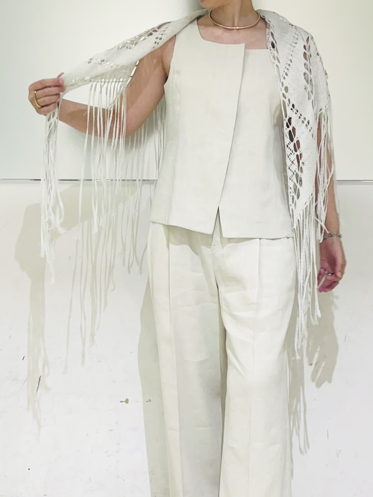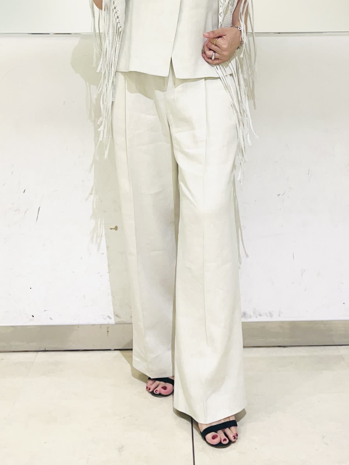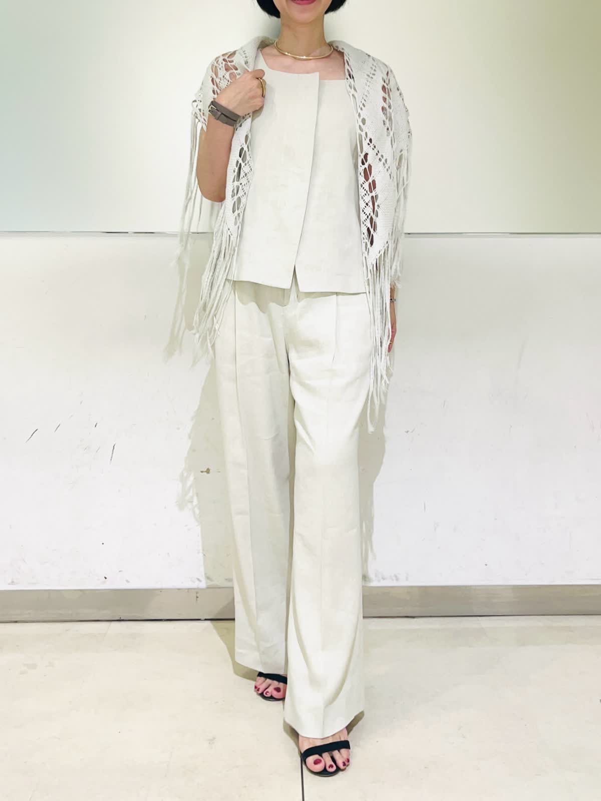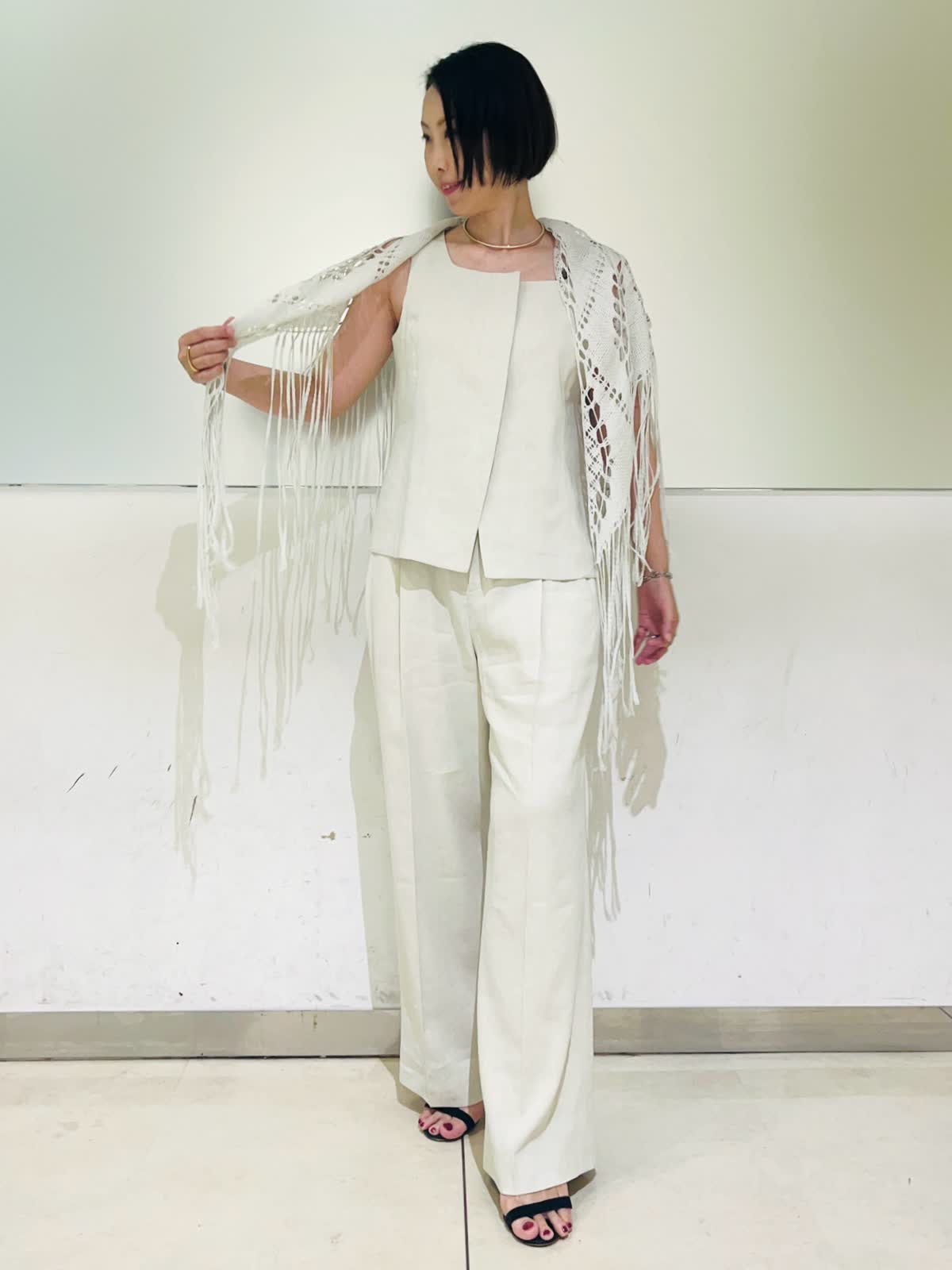 【着用アイテム/カラー】ジレ、パンツ、ジャケット:9号/アイボリー 柔らかなアイボリーが上品な大人のリネン2ピース。スクエアネックがすっきりしたジレに程よいセミワイドのパンツの絶妙バランス。レースストールを羽織れば肌の露出も控えめになり、大人世代でも安心です。 同素材でジャケットもあるので、3ピースで揃えても便利です。