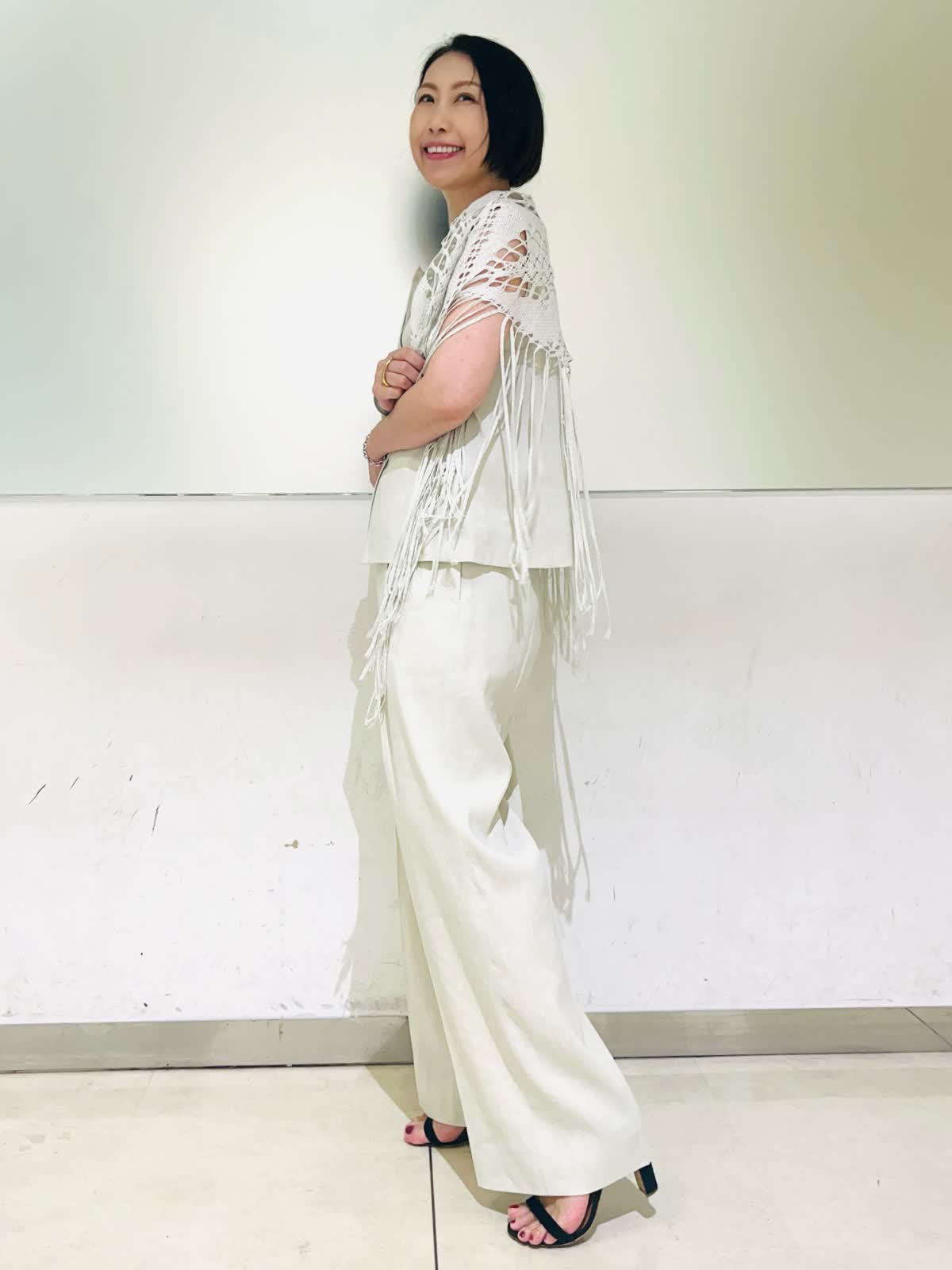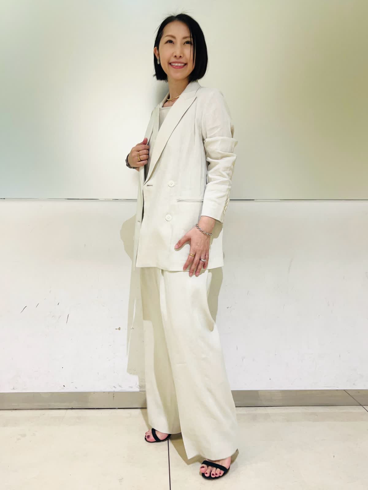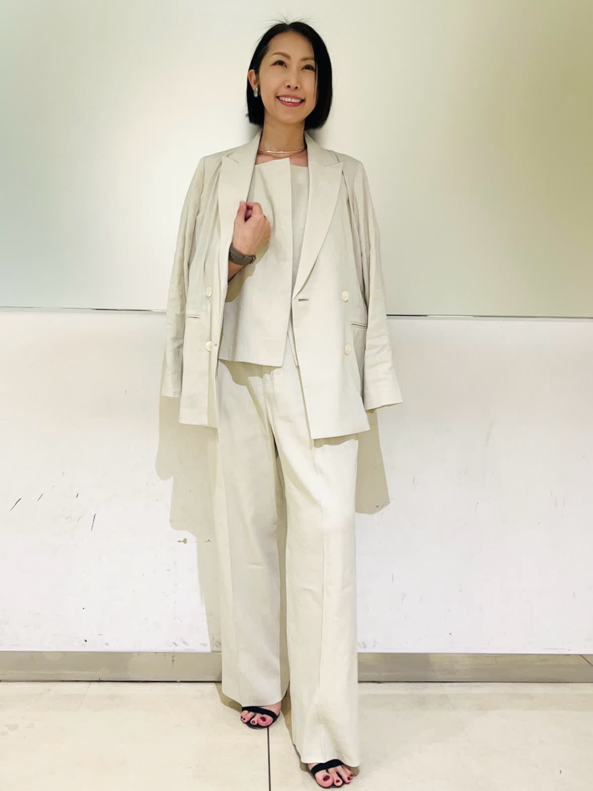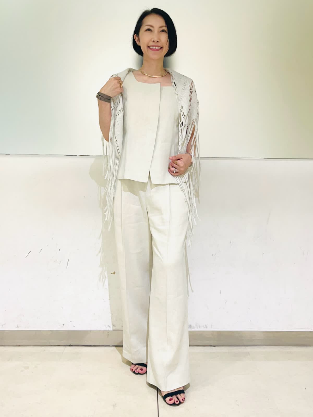 【着用アイテム/カラー】ジレ、パンツ、ジャケット:9号/アイボリー 柔らかなアイボリーが上品な大人のリネン2ピース。スクエアネックがすっきりしたジレに程よいセミワイドのパンツの絶妙バランス。レースストールを羽織れば肌の露出も控えめになり、大人世代でも安心です。 同素材でジャケットもあるので、3ピースで揃えても便利です。