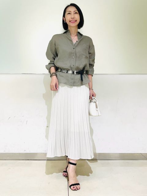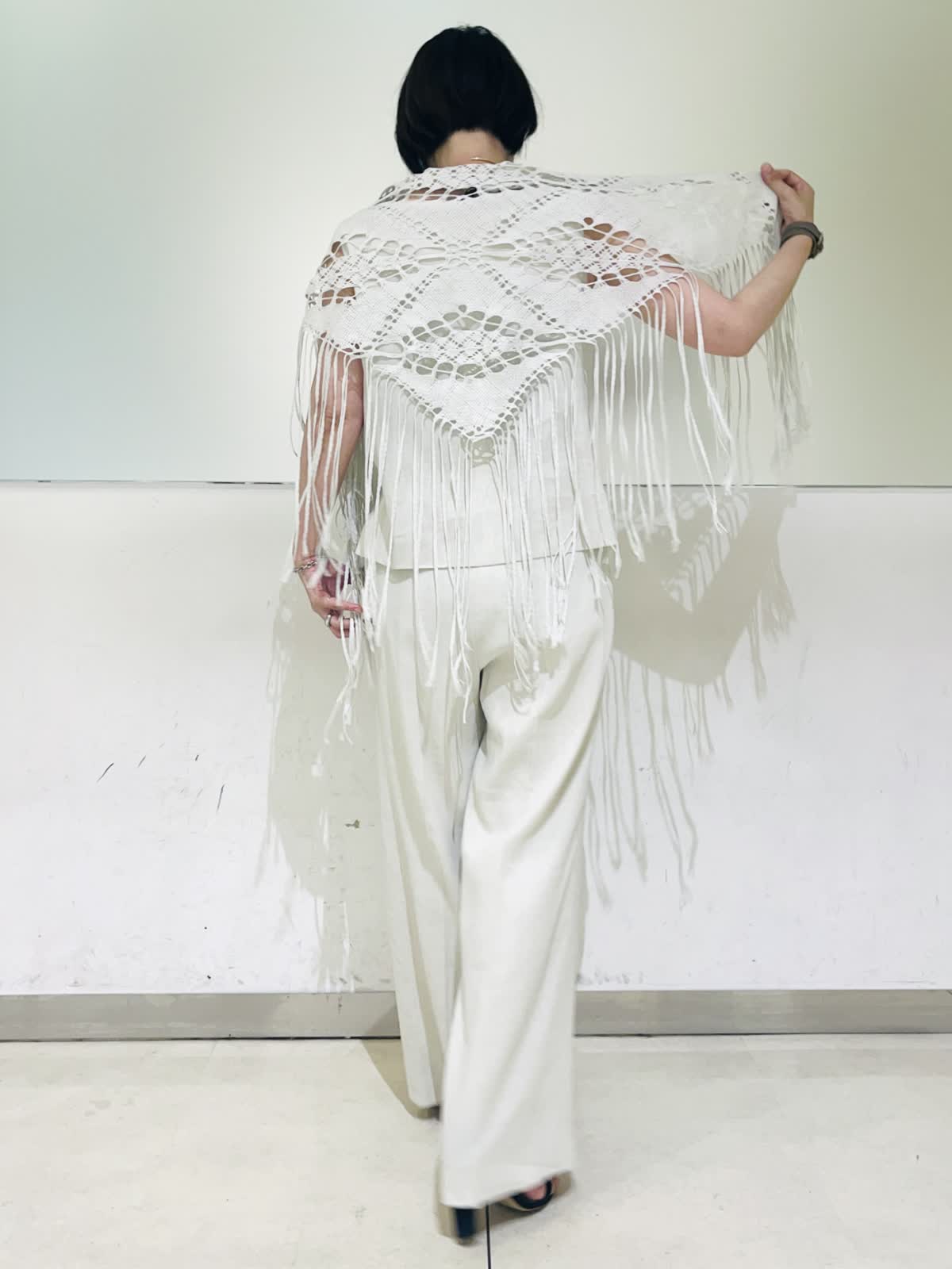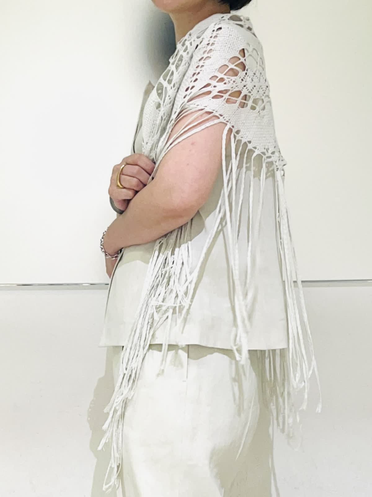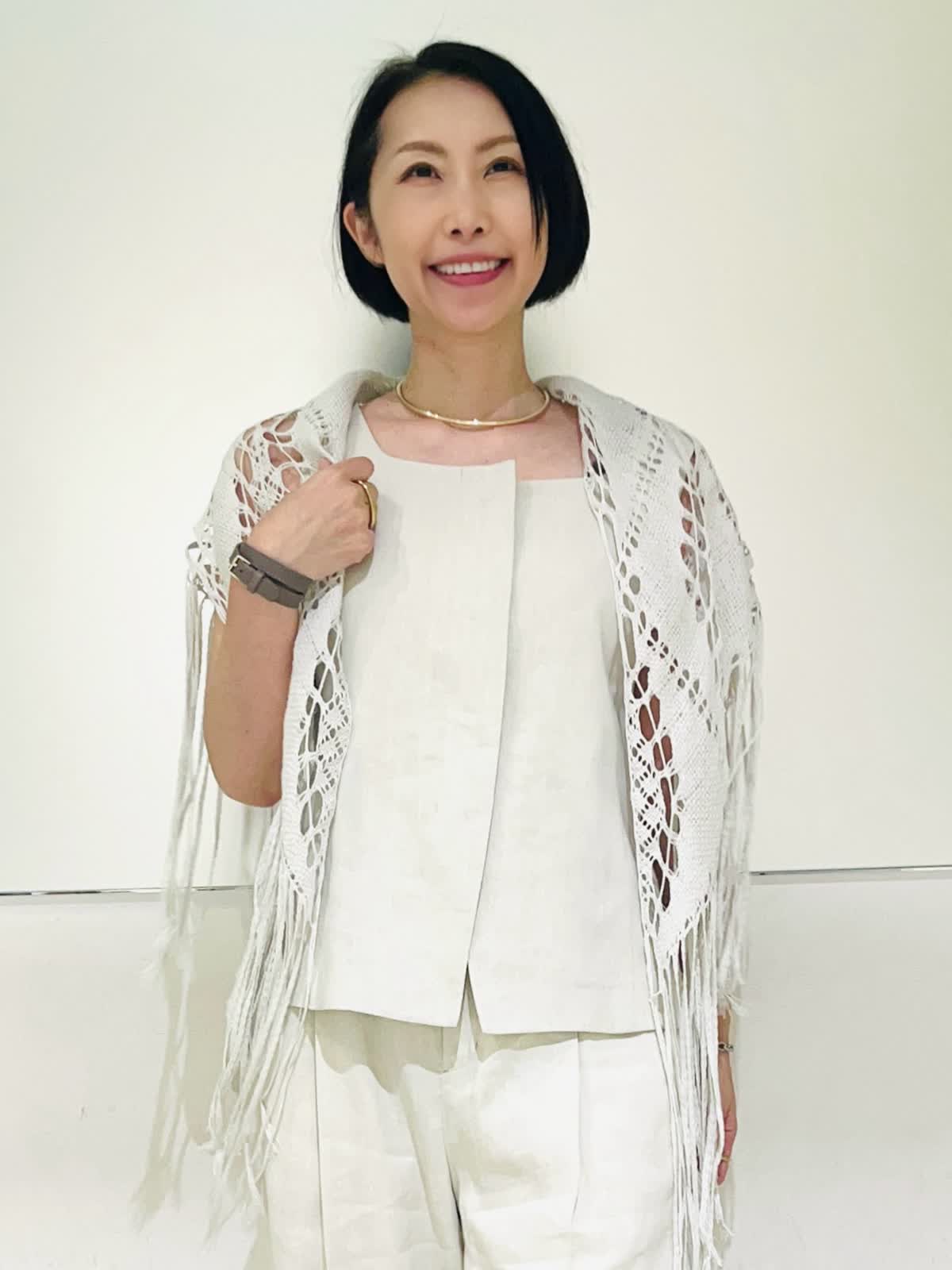 【着用アイテム/カラー】ジレ、パンツ、ジャケット:9号/アイボリー 柔らかなアイボリーが上品な大人のリネン2ピース。スクエアネックがすっきりしたジレに程よいセミワイドのパンツの絶妙バランス。レースストールを羽織れば肌の露出も控えめになり、大人世代でも安心です。 同素材でジャケットもあるので、3ピースで揃えても便利です。