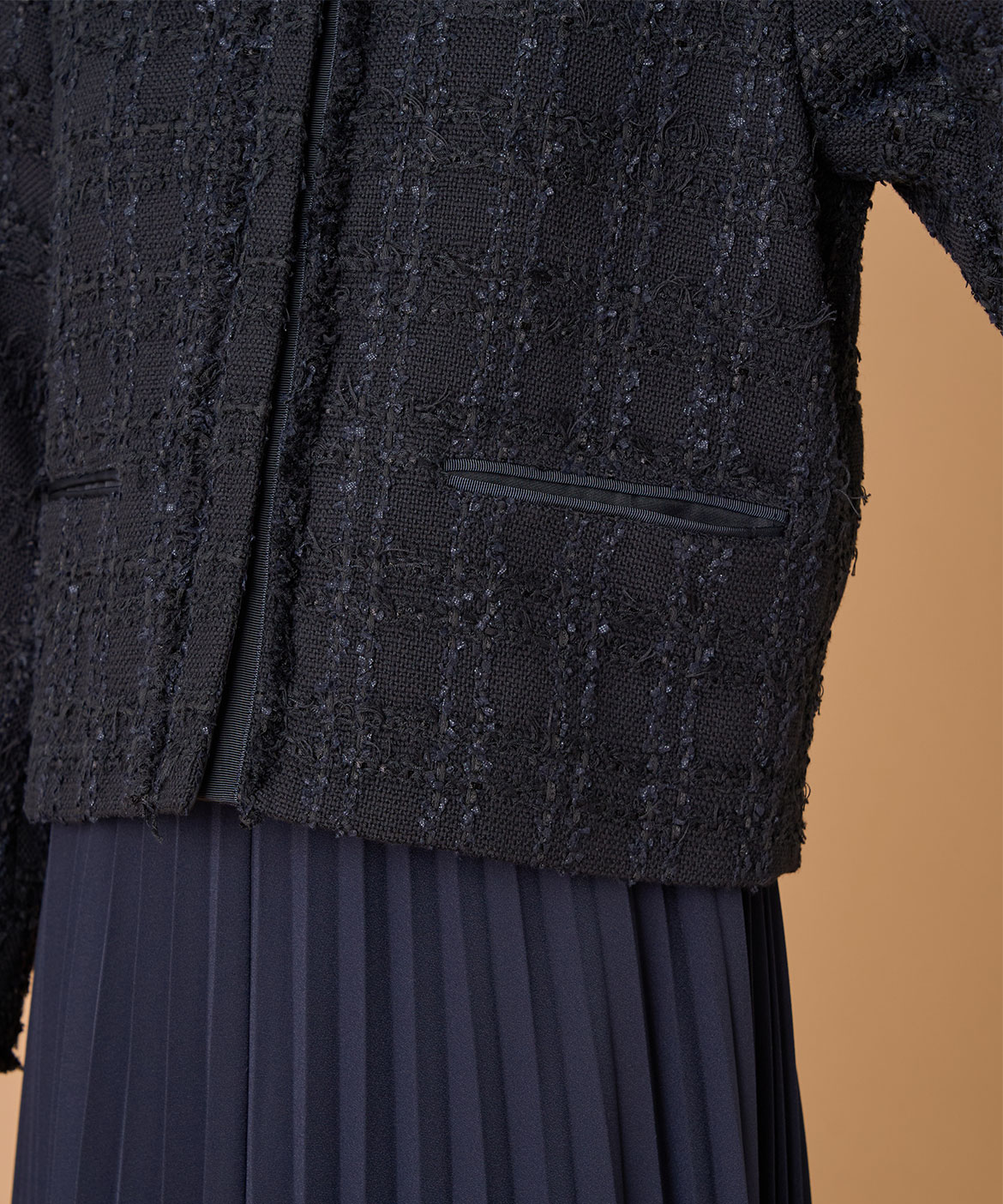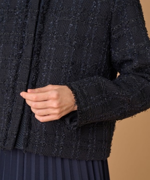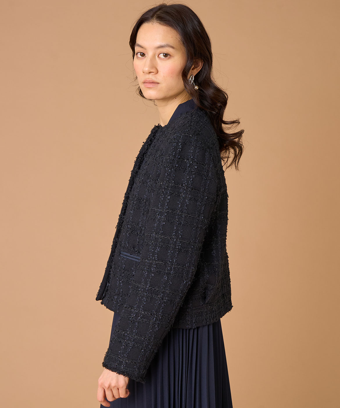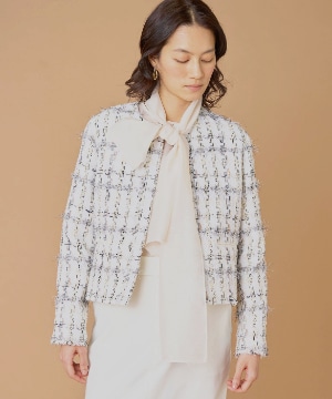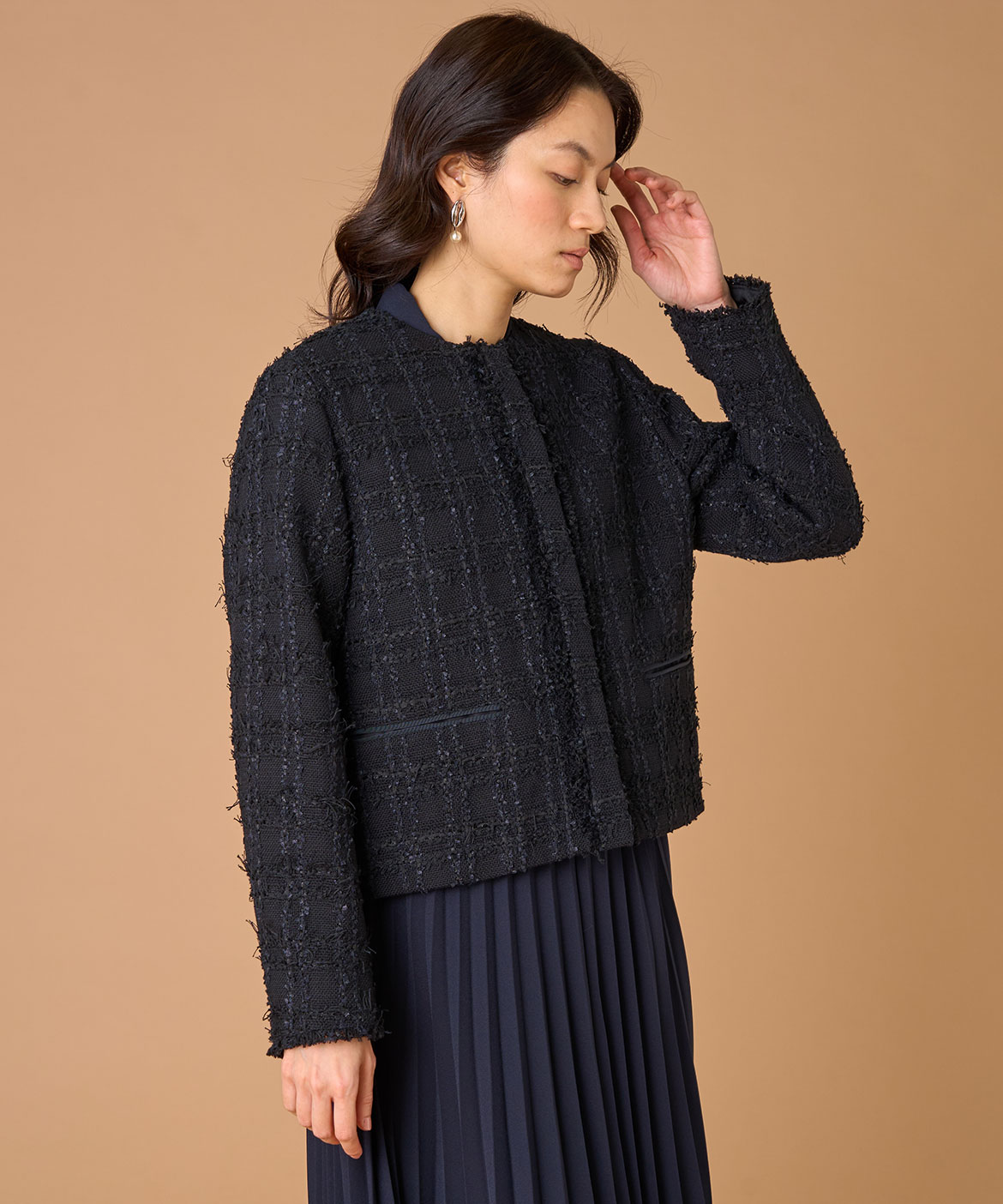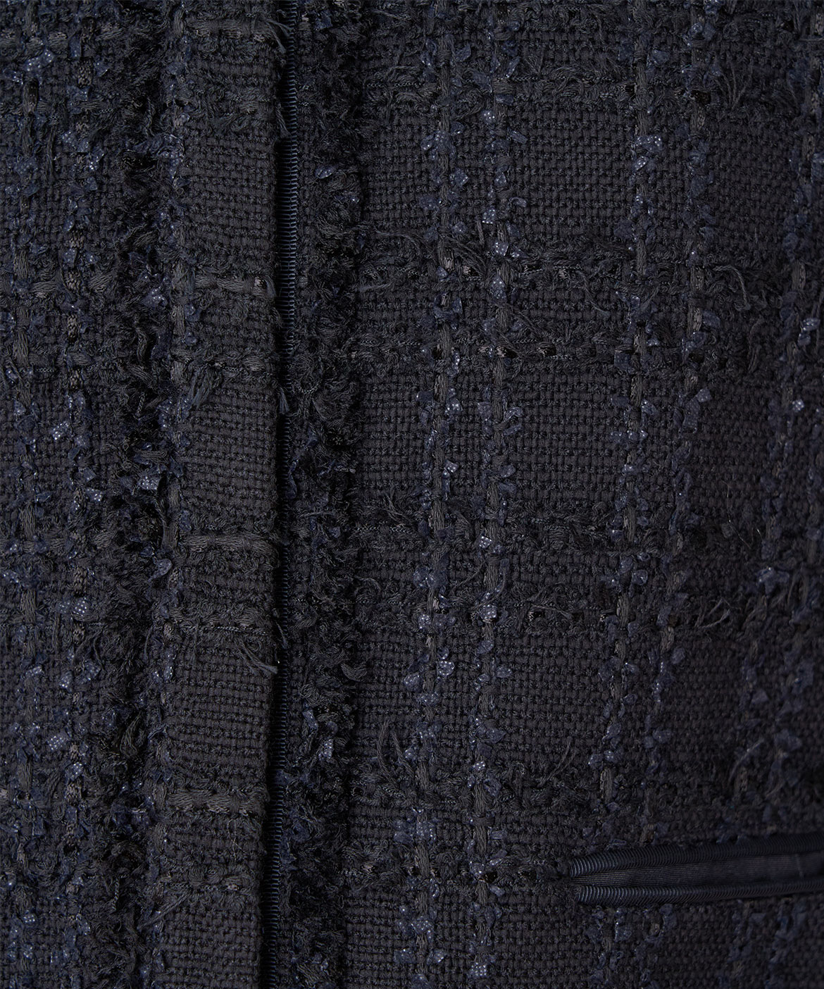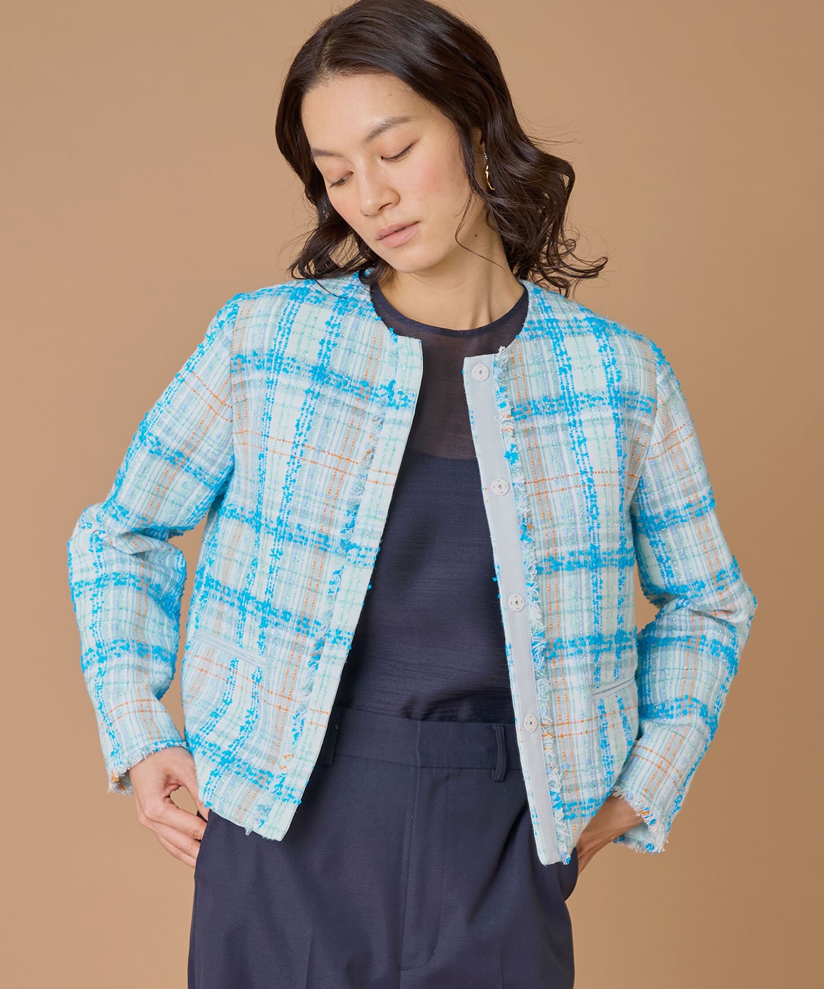 イギリスの老舗LINTON社の高品質なファンシーツイードでデザインされたジャケットです。様々な糸によって生み出される表情が上品かつクラス感のある雰囲気になっています。前立て、袖口をフリンジ仕様にし、後ろ裾には切り替えてタックを入れたことでカジュアルな抜け感をプラスしています。合わせるアイテム次第でオフィスやセレモニー、デイリーまで幅広いシーンで活躍出来るアイテムです。