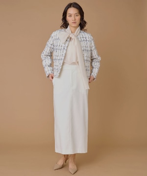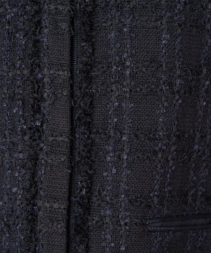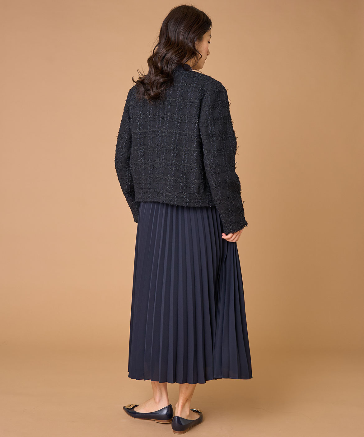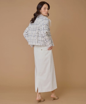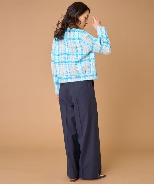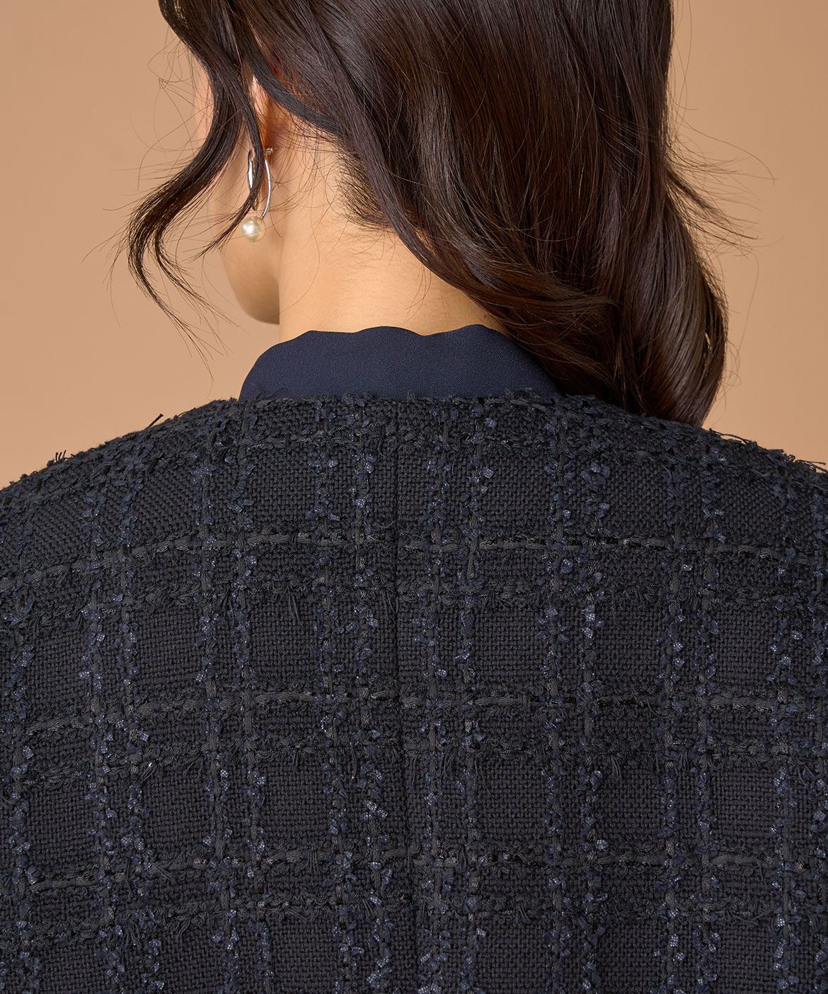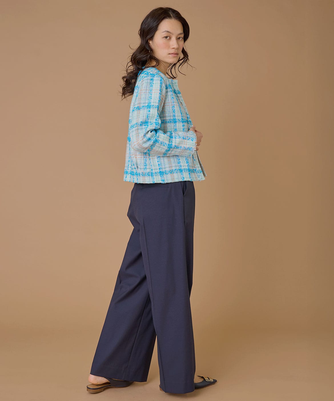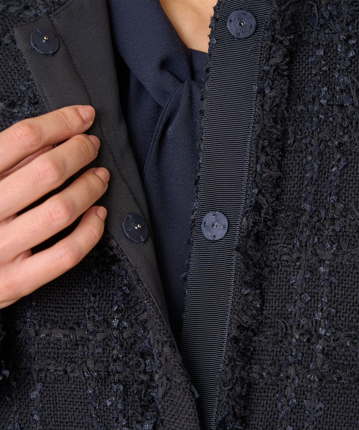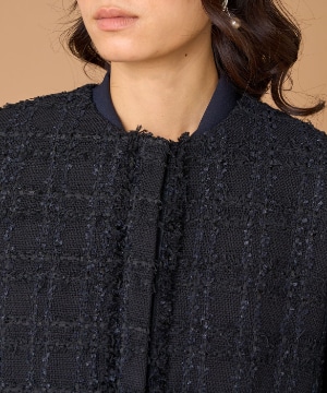 イギリスの老舗LINTON社の高品質なファンシーツイードでデザインされたジャケットです。様々な糸によって生み出される表情が上品かつクラス感のある雰囲気になっています。前立て、袖口をフリンジ仕様にし、後ろ裾には切り替えてタックを入れたことでカジュアルな抜け感をプラスしています。合わせるアイテム次第でオフィスやセレモニー、デイリーまで幅広いシーンで活躍出来るアイテムです。